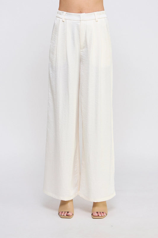 Cream Satin Zip Pleat Front Wide Leg Pant