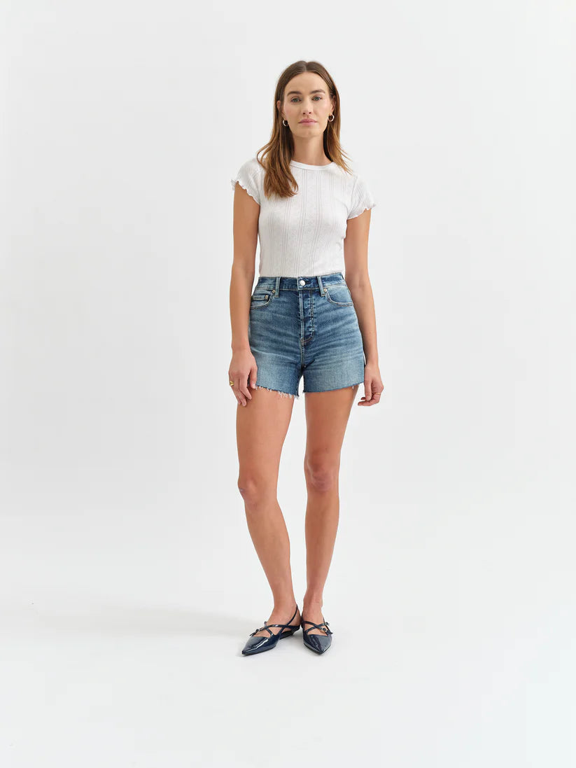 The Bottom Line is a high rise denim short with slightly more coverage than your average cut-off. This versatile short features scissor-cut hems set against a dark wash with dramatic highs and lows. Constructed from our Hug fabric, this short is flexible enough to hug your body, heavy enough to cinch you in.